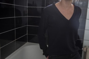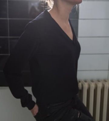 Mikina s výstřihem do V, tenkým lemem kolem krku a lemy na rukávech a v pase.